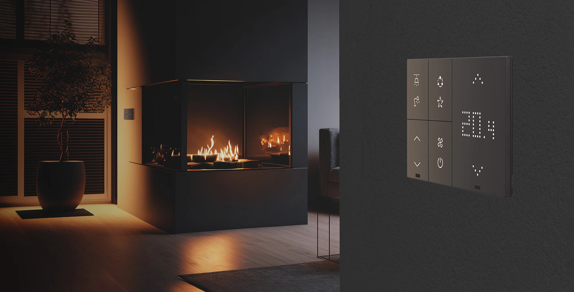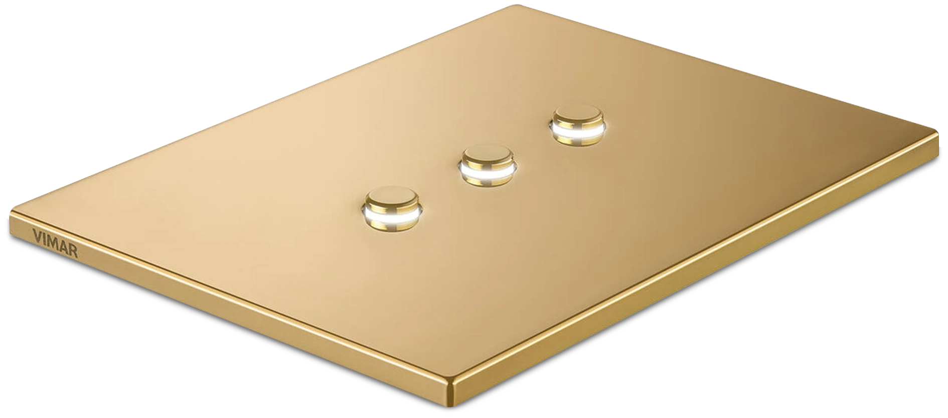 La base del control se retroilumina, creando un halo tenue y sofisticado entre el botón y la placa.